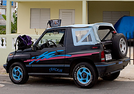 The rental cars range from full size Jeeps to smaller Suzuki's and Geo's like the one in the picture. It doesn't take much of a car to get around on the island, the roads are narrow and the speeds are generally in the 30's. At these slower speeds it's great to roll down the windows and enjoy the day. Coming around any corner you may find horses, cattle, goats or chickens in the middle of the road. Many roads are dirt roads, and even the paved roads have drainage “features”. So take it easy!